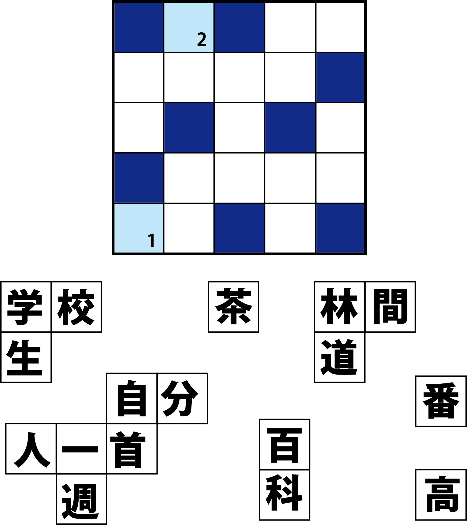 ・ピースをすべてマス目の中に入れて、クロスワードパズルの盤面を完成させましょう。