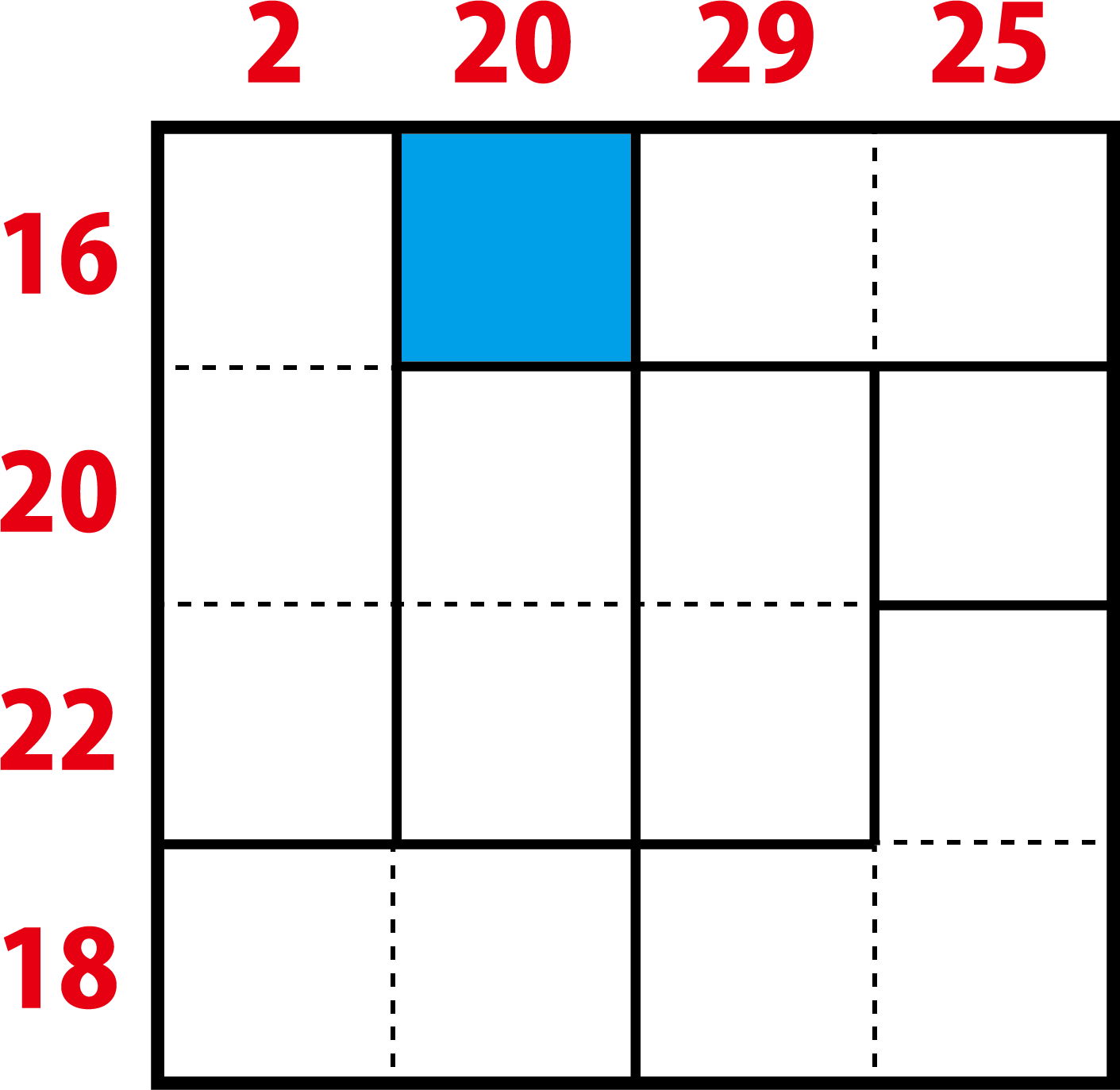 ・マス目の上に書かれている赤い数字は、その下の列に入る数字の合計です。