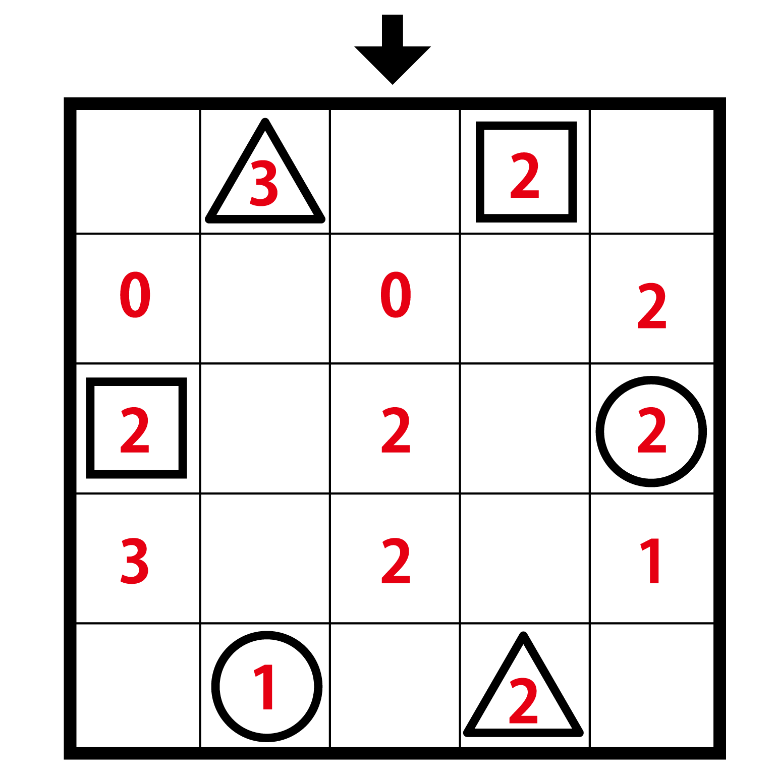 ・丸、三角、四角の記号がついた数字は、上下左右に隣り合うマスに入る同じ記号(丸、三角、四角)の数を表します。
