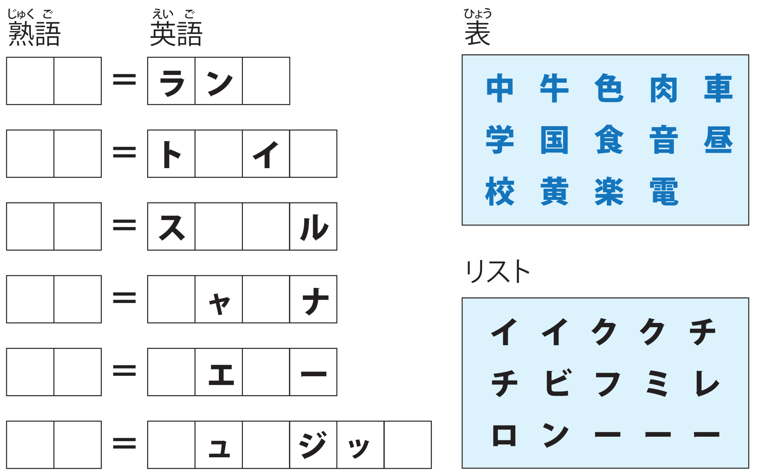 ・左側の熟語は表から漢字を選んで作ります。右側の英語はリストからカタカナを選んで作ります。