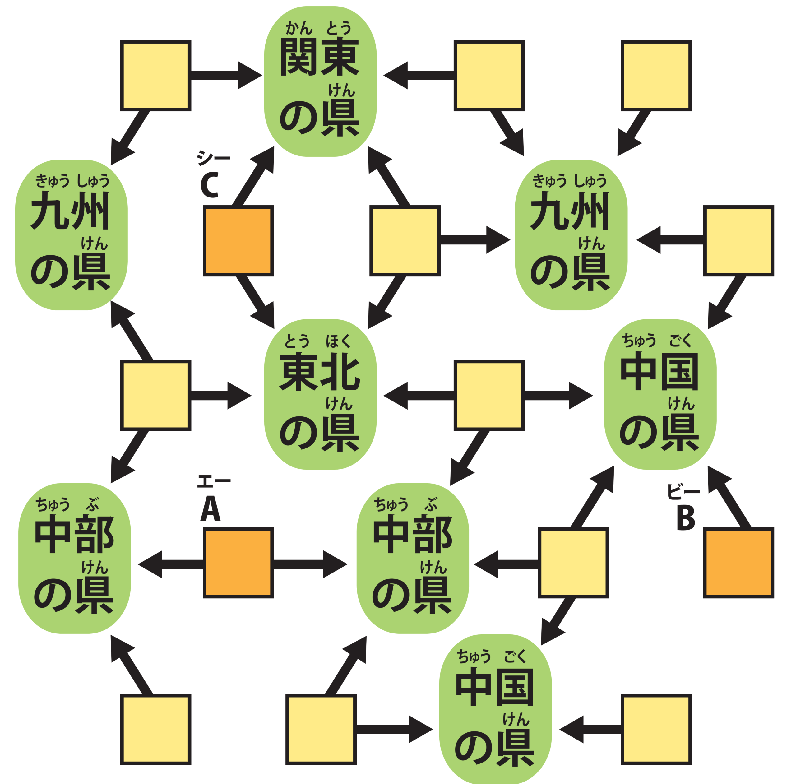 ・同じ丸のマスに矢印が向いている四角マスを組み合わせると、県名ができます。