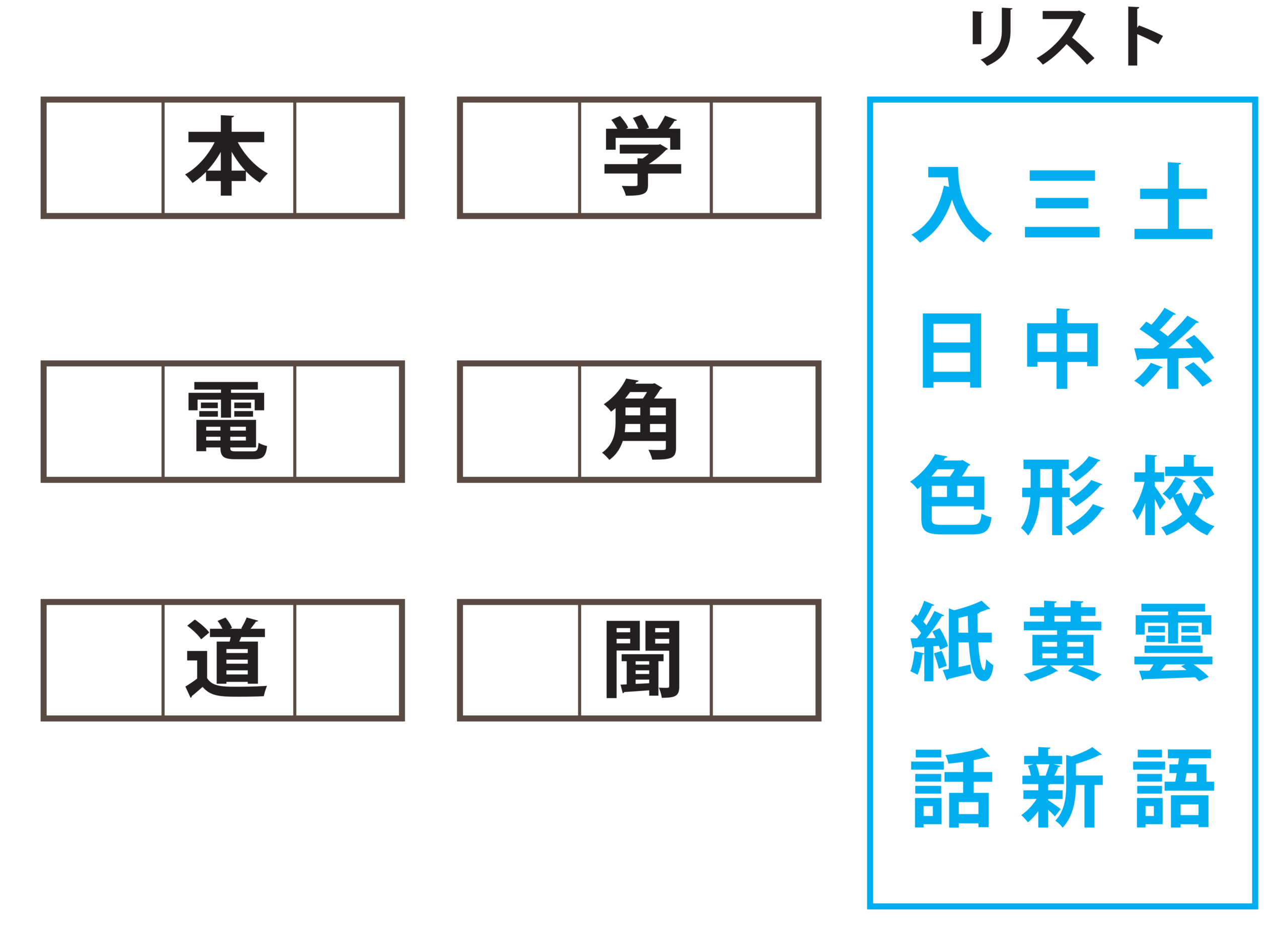 ・リストの漢字を空いたマスに当てはめて、漢字3文字の言葉を6個作りましょう。